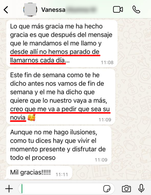 Vanessa, administradora de fincas con 39 años, después de un par de citas, sentía que la relación se quedaba en mensajes monótonos que no iban a más. Ahora ya lleva 3 meses saliendo con un chico que está súper interesado en ella y que quiere tener un compromiso serio con ella.
